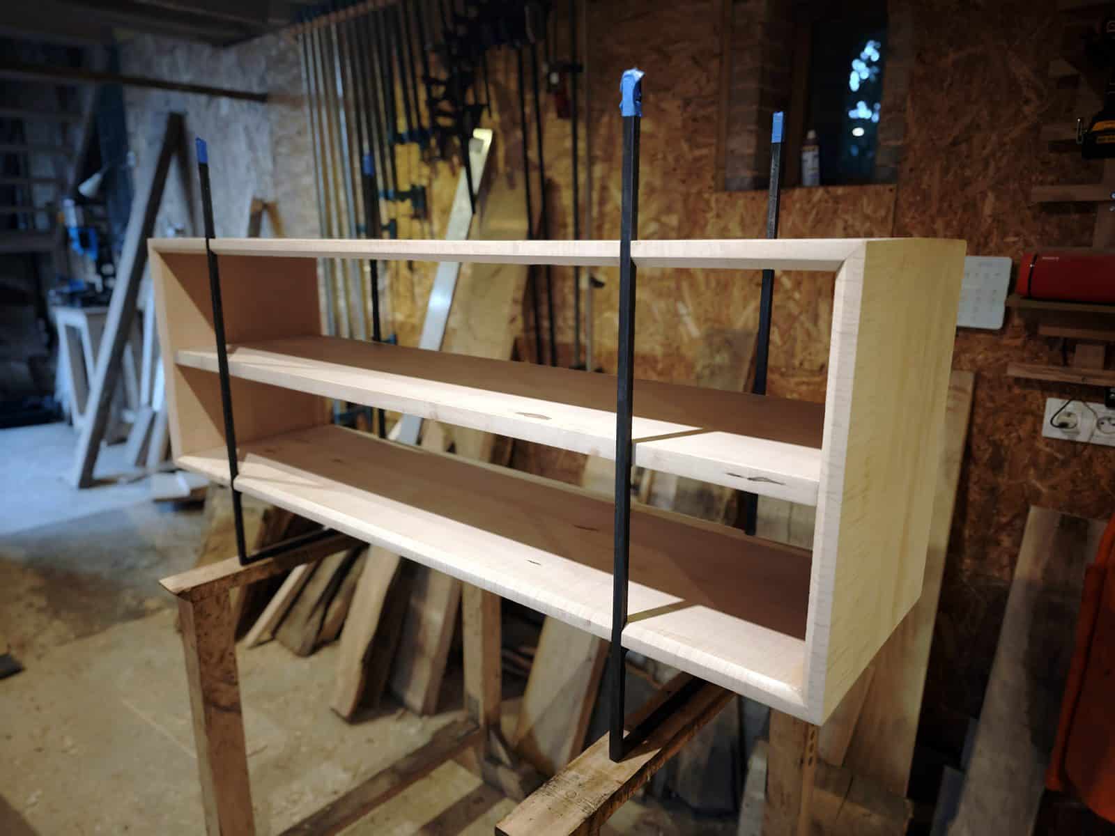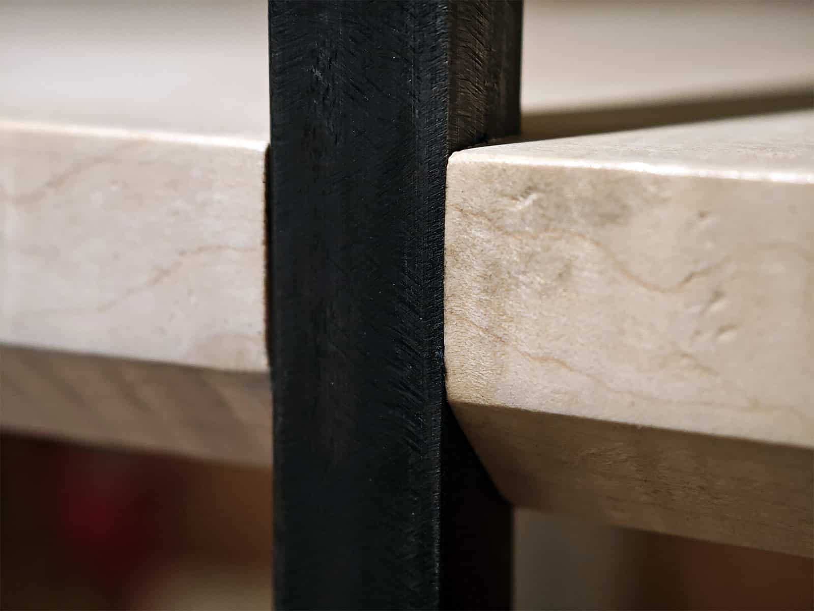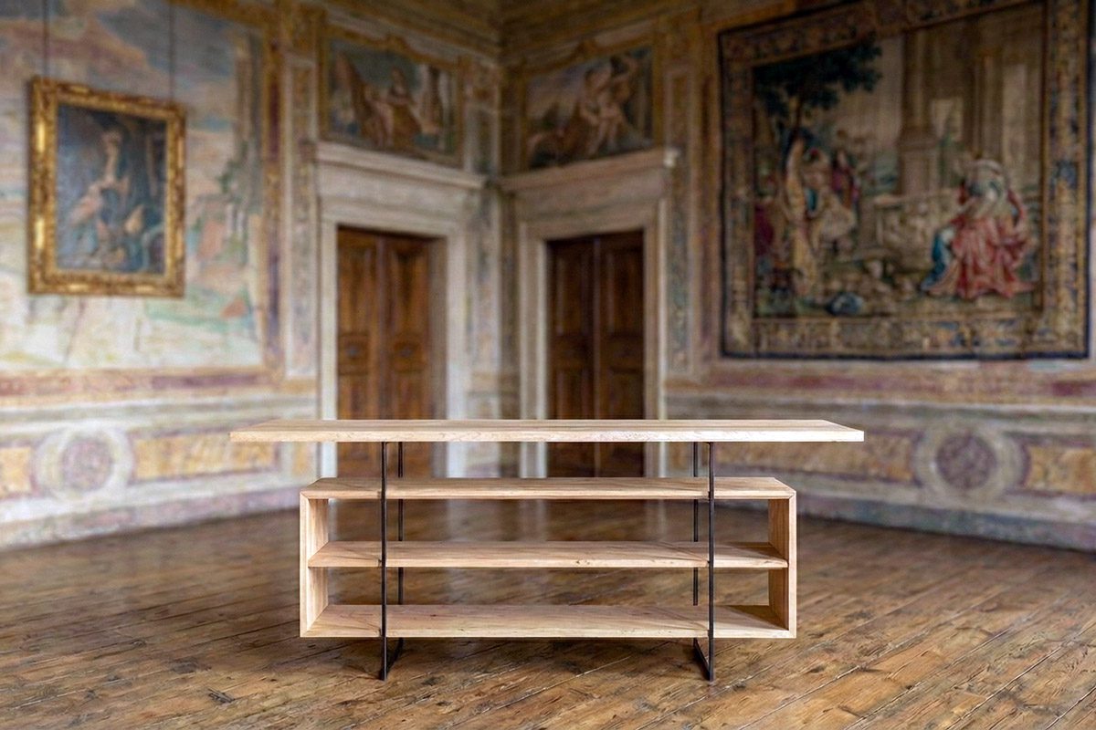 La structure du meuble, et son plateau, d’une longueur majestueuse de 1,80 m, est réalisé en érable champêtre massif. Un bois lumineux, au grain fin et aux ondes parfois capricieuses, accroche la lumière avec douceur, révélant des reflets nacrés et une chaleur tactile unique. Il a été sélectionné pour sa clarté, offrant un contraste saisissant avec la rigueur du piétement.